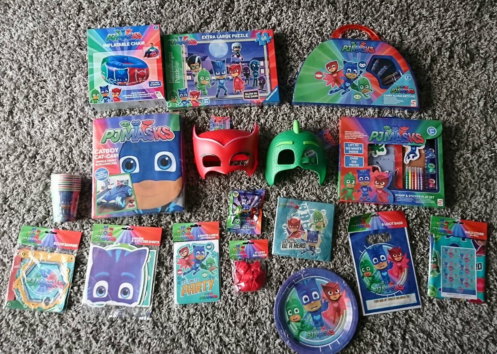 We received a huge box of character goodies; an inflatable chair, glow in the dark puzzle, art case, stamp and sticker playset, Catboy bedding set (RRP £29.99), two character masks, a blind bag (RRP £3.99 - we got Romeo!) and lots of partyware.