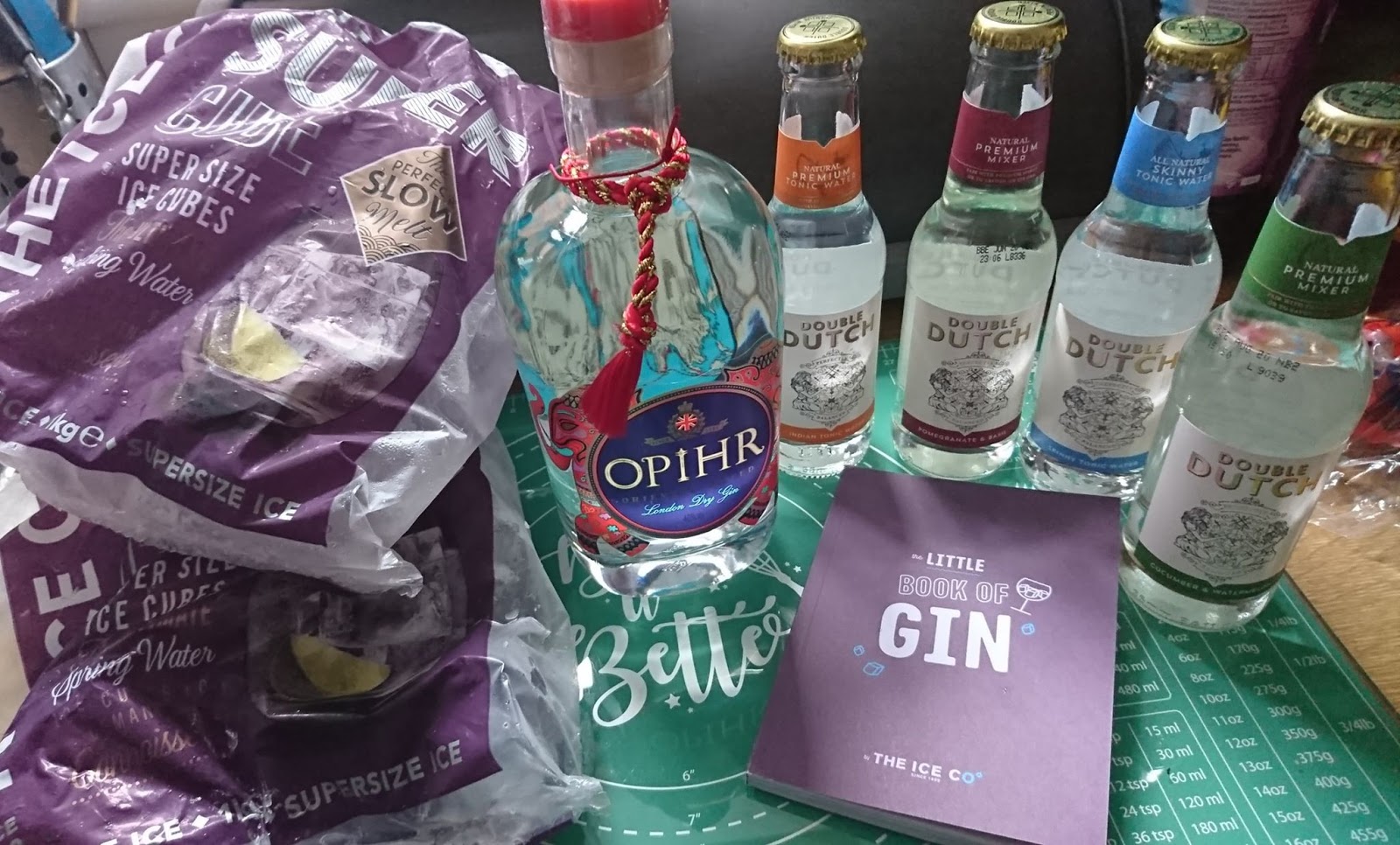 A bottle of Opihr gin, a gin book, four Double Dutch mixers and two bags of The Ice Co ice